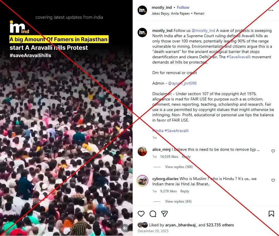 Social media posts shared on December 20, 2025, claimed that a wave of protests was sweeping North India in response to the Supreme Court ruling. The post included a video that depicted large crowds, with text reading, “A big amount of farmers in Rajasthan start a Aravalli hills protest.” However, further investigation revealed that the footage predates the Supreme Court’s decision by several months.